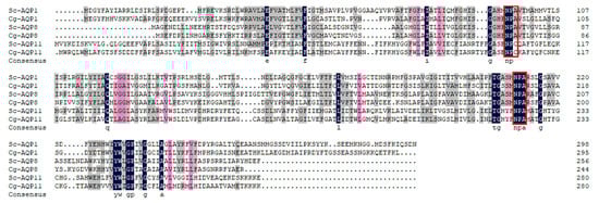 Alignment of the amino acid sequences among Sc-AQP1, Sc-AQP8, Sc-AQP11, Cg-AQP1, Cg-AQP8, and Cg-AQP11. The aligned sequences are as follows: Sc-AQP1, QIE08067.1; Sc-AQP8, QIE08068.1; Sc-AQP11, QIE08069.1; Cg-AQP1, XP_011446842.2; Cg-AQP8, XP_011436665.2; Cg-AQP11, XP_019923893.2. Cg indicated the Crassostrea gigas (Thunberg, 1793). Identical (dark blue) and similar (pink and gray) residues were indicated. Conserved NPA and NPC motifs are marked with the red frame.