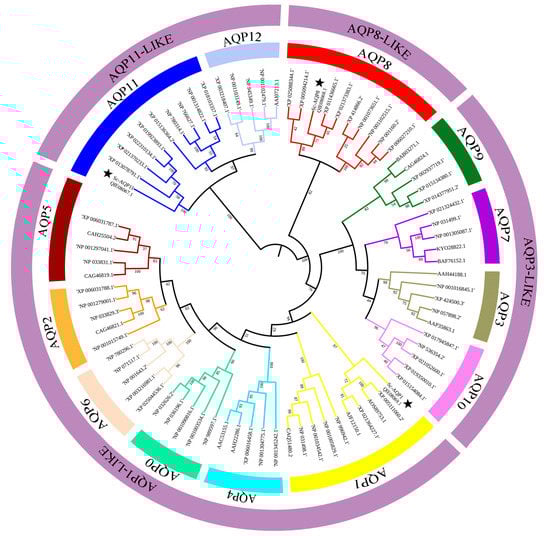 Phylogenetic analysis of three Sc-AQPs (Sc-AQP1, Sc-AQP8, and Sc-AQP11) with AQP family members of other species. The phylogeny tree was built by using amino acid sequences of 80 available AQPs. The AQP genes of S. constricta are labeled with star. The sequences are described by the GenBank accession number, and the detailed information of these sequences are included in Supplementary Table S1.