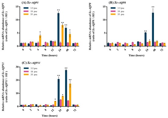 Temporal expressions of the Sc-AQP1 (A), Sc-AQP8 (B), and Sc-AQP11 (C) after salinity challenge of 3.5, 18, and 35 psu. Vertical bars represent the mean ± SE (n = 15). Data were statistically analyzed by using one-way ANOVA followed by the LSD test. The asterisks (*) show a significant difference between the salinity challenge group (3.5 and 35 psu) and the control group (18 psu) at each sampling time. Note: * p < 0.05; ** p < 0.01.