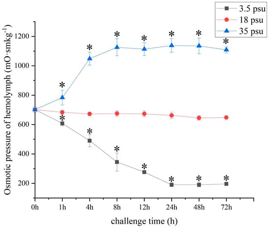 Osmotic pressure changes in S. constricta post-exposure to the low- and high-salinity environment. Vertical bars represent the mean ± SE (n = 5). Data were statistically analyzed by using one-way ANOVA, followed by the LSD test. The asterisks (*) show a significant difference between the experimental group (low- and high-salinity group) and the control group at each sampling time. Note: * p < 0.05.