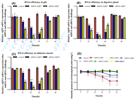 Relative expression levels of Sc-AQP1 (A), Sc-AQP8 (B), and Sc-AQP11 (C) and osmotic pressure changes (D) in S. constricta post-injection with DEPC-treated water and corresponding dsRNA and siRNA. Vertical bars represent the mean ± SE (n = 5). Data were statistically analyzed by using one-way ANOVA, followed by the LSD test. The asterisks (*) show a significant difference between the RNA interference group (dsRNA and siRNA) and the control group at each sampling time. Note: * p < 0.05; ** p < 0.01.