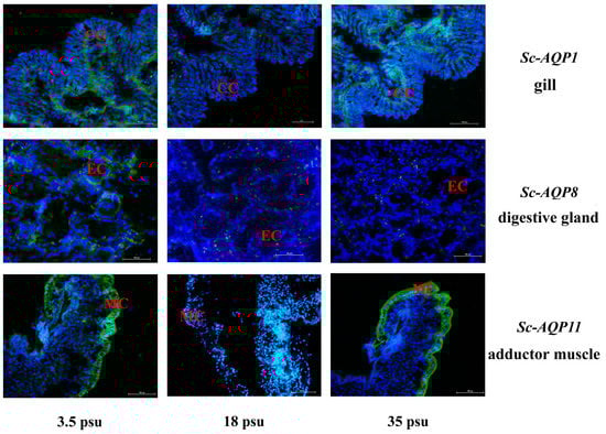Immunofluorescence of Sc-AQP1, Sc-AQP8, and Sc-AQP11 in different tissues. The positive signal of Sc-AQPs genes is indicated in green, and nuclei were stained with DAPI in blue. CCs, columnar cells. ECs, endothelial cells. MCs, muscle cells. Scale bars are 100 µm.