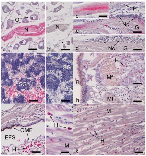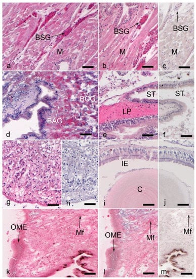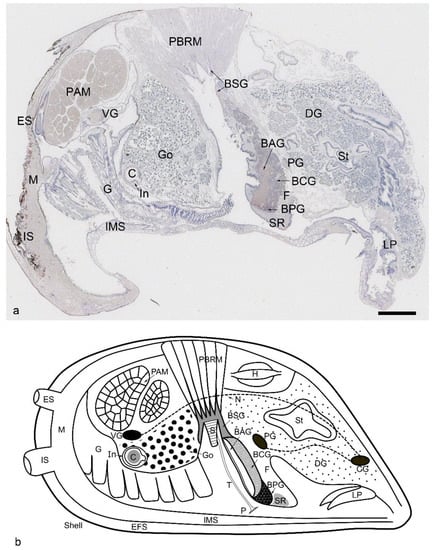 - Corbetta, S.; Bairati, A.; Vitellaro Zuccarello, L. Immunohistochemical study of subepidermal connective of molluscan integument. Eur. J. Histochem. 2002, 46, 259–272. [Google Scholar] [CrossRef] [PubMed]