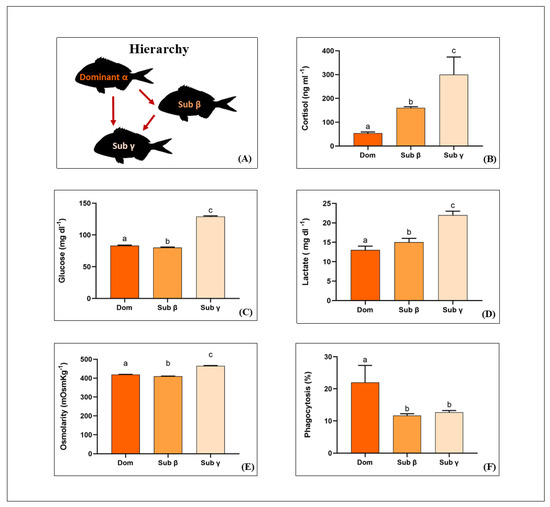 Mean (±SD) of plasmatic parameters of dominant (α) (orange histogram) (n = 9), subordinate (β) (pale orange histogram) (n = 9), and subordinate (γ) (pinkish histogram) (n = 9) sea bream (Sparus aurata). The panel (A) presents the social relationship between dominant (α) and subordinates (β and γ). Arrow indicates social domination from an individual toward the other. (B) Cortisol concentration (ng mL−1), (C) glucose concentration (mg dL−1), (D) lactate concentration (mg dL−1), (E) osmolarity level (mOsmKg−1) and (F) Phagocytosis (%). Different lowercase letters over the bars indicate significant statistical difference between groups, same lowercase letters over the bars indicate absence of statistical differences (GLMM followed by Tukey HSD post-hoc test, p < 0.05).