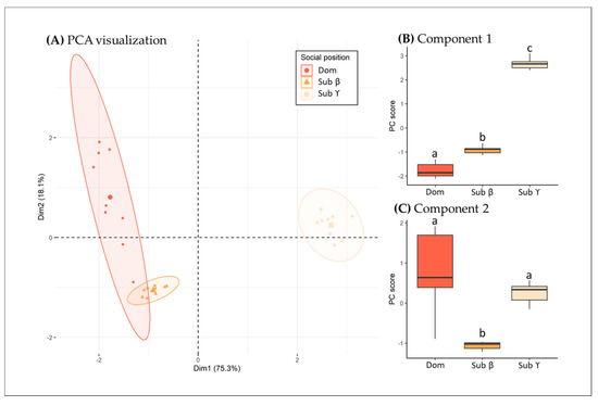Looking at the individual positioning on the first component of the PCA (Figure 2A), fish from the subordinate group Υ displayed greater values than fish from the subordinate group β (p < 0.001), displaying greater values than dominant fish (p = 0.04). The second component of the PCA is also affected by the social position of the sea bream (p < 0.001). In more detail, the subordinate fish β displayed lower values on the second component of the PCA than both dominant fish and subordinate Υ (p < 0.001 and p = 0.007, respectively). Dominant and subordinate Υ are displaying similar values in component 2 of the PCA (p = 0.48). Overall, the results of the PCA support the previous results, suggesting that subordinate sea breams displayed higher level of stress than dominant ones in triads.