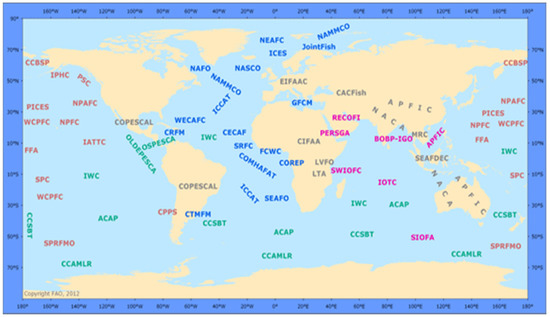 Illustrative Map of the Regional Fisheries Bodies. Reproduced from [19], with permission from Food and Agriculture Organization of the United Nations, 2022.