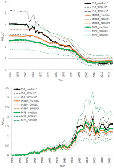 Comparison of the results from different models between 1950 and 2017 for Atlantic BET with 90% confidence intervals. * indicates the results from SS3 are distinguished from the other two models and decided as the stock assessment recommendations to the Commission. Reproduced from [29], with permission from International Commission for the Conservation of Atlantic Tunas, 2022.