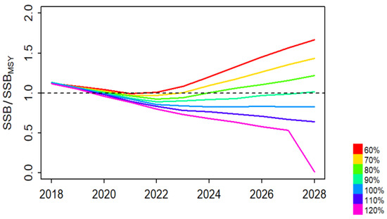 Among these models, the results based on the SS3 model were selected as the management advice for BET, because a more comprehensive range of model options was investigated, and a range of diagnostics indicated that the model represented a reasonable fit to the data from fisheries and their biology. Finally, the assessment was concluded by producing projections from assessment models (shown in Figure 5 and Table 2) to indicate scientifically an optimal, sustainable level of exploitation for the BET resource for the references of the Scientific Committee, as well as the Commission [36].