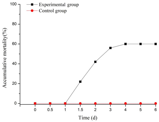 After the artificial infection, the turtles in the experimental group began to die as of 1 dp.i. and displayed an increase in mortality from 1 to 4 dp.i., and then it showed a stable death ratio after 4 dp.i. (black line). During the whole process, all of the turtles in the control group (injected with NS, red line) showed no death (shown in Figure 1).