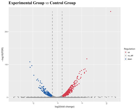 A total of 3987 unigenes showed differentially expressed levels between the experimental group and the control group, among them, the significantly upregulated unigenes and downregulated unigenes were 2065 and 1922, respectively. The differentially expressed gene volcano plots is shown in Figure 2.