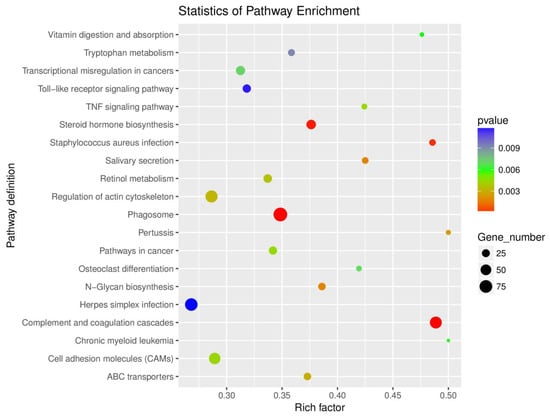 By a KEGG pathway enrichment analysis (shown in Figure 4), the DEGs of the experimental and control groups were enriched in a total of 43 pathways (p value < 0.05); they were mainly enriched in 20 pathways, especially in complement and coagulation cascades, phagosome, and steroid hormone biosynthesis. Among them, important immune response related pathways included complement and coagulation cascades, phagosome, toll-like receptor signaling pathway, TNF signaling pathway, and ABC transporters, etc., while vital metabolic regulation related pathways included steroid hormone biosynthesis, vitamin digestion and absorption, tryptophan metabolism, retinol metabolism, and N-Glycan biosynthesis, etc.