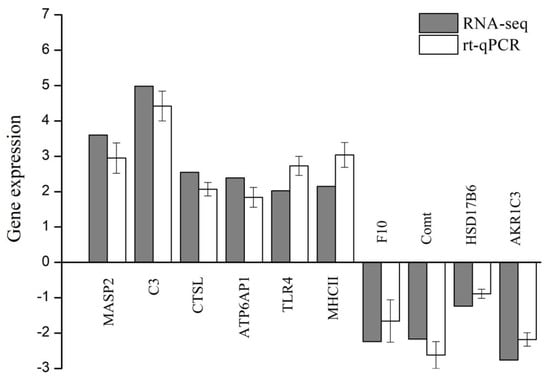 The ten DEGs involved in the three key pathways were randomly chosen, and their expressions were validated by real-time quantitative PCR (shown in Figure 5). The qPCR results were mainly consistent with the results of RNA-seq except for slight differences in expression levels.
