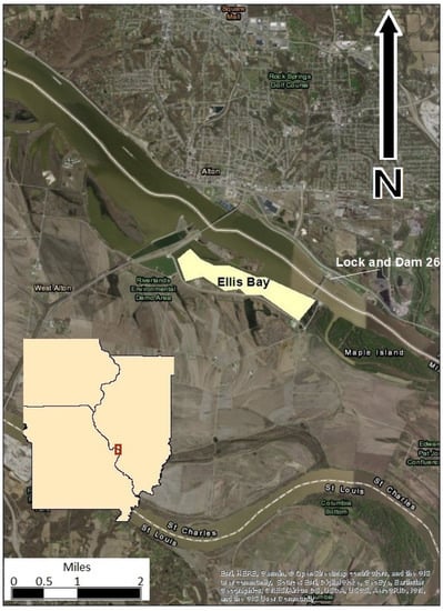 Blue catfish were captured in April 2013, September 2013, and monthly from April through September 2014 in Ellis Bay. Ellis Bay is a contiguous backwater at the lower end of Pool 26 of the Mississippi River (i.e., at river km 325) and was created by the impoundment formed by Lock and Dam 26 (Figure 1).