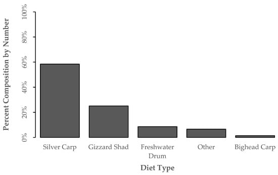 Invasive species are capable of altering native aquatic food webs through competitive interaction with native biota for food and resources []. Although negative consequences are often emphasized, non-native introductions can at times also benefit native species as an abundant alternate forage base. Magoulick and Lewis [] determined that invasive zebra mussels Dreissena polymorpha served as additional forage for three native molluscivores (blue catfish Ictalurus furcatus, freshwater drum Aplodinotus grunniens, redear sunfish Lepomis microlophus) in the Mississippi River. Steinhart et al. [] reported a similar finding in Lake Michigan, showing that juvenile Smallmouth Bass Micropterus dolomieu predation on non-native round goby Neogobius melanostomus, resulted in an increased rate of growth and a quicker transition into piscivory for young of the year smallmouth bass. Recently, bigheaded carps (silver carp Hypophthalmichthys molitrix and bighead carp H. nobilis) have been shown to occur in the diets of native piscivores on the Illinois River, making up to 66% frequency of occurrence and 60% diet composition by number [].