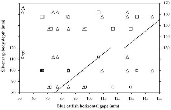 Age-predicted silver carp body depth plotted against measured (triangle points) and estimated (square points) horizontal gape of the consuming blue catfish for the 21 blue catfish, which contained age-able silver carp in their stomachs. The difference in panels (A,B) are in which length-at-age curve was used to convert silver carp age estimates to silver carp body depth estimates. In panel (A), length at age was based on middle Mississippi River data collected during 1998–2001 []. In panel (B), length at age was based on data collected prior to 1954 from the Amur River in Russia [,].