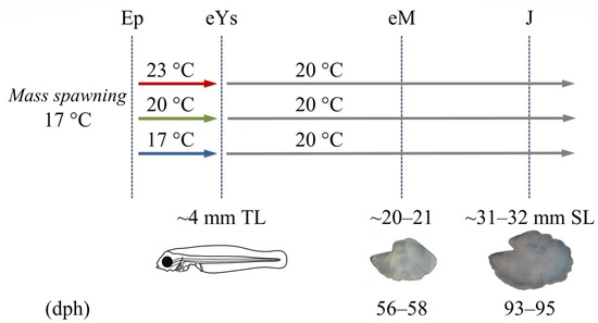 - Fuiman, L.A.; Poling, K.R.; Higgs, D.M. Quantifying developmental progress for comparative studies of larval fishes. Copeia 1998, 1998, 602–611. [Google Scholar] [CrossRef]