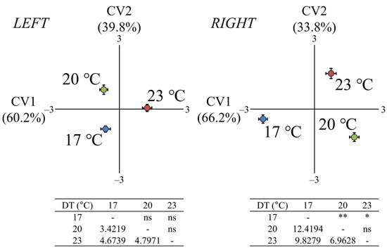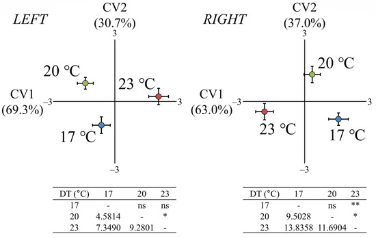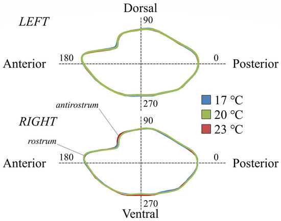 3.1. Effect of Developmental Temperature on the Otolith Shape