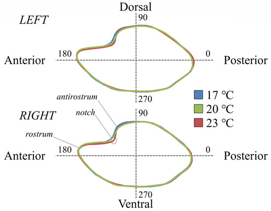 3.2. Effect of Developmental Temperature on the Otolith Asymmetry