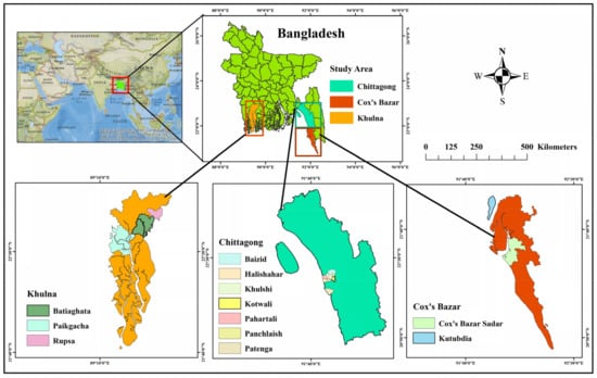 Most fish-processing industries are located in three coastal districts of Bangladesh, namely Khulna, Chittagong, and Cox’s Bazar. Therefore, Khulna (Batiaghata, Paikgacha, and Rupsa), Chittagong (Baizid, Halishahar, Khulshi, Kotwali, Pahartali, Panchlaish, and Patenga), and Cox’s Bazar (Sadar Upazila and Kutubdia) were selected as study areas (Figure 1). These chosen study areas offer high potential for fresh and brackish water capture and culture fisheries, including vast marine resources. The interviewees were from different locations in the districts (fish landing centers, fishers’ households, fish markets, fish-processing industries, dry fish yards, and government offices).