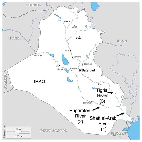The Shatt al-Arab river, around 200 km long, is formed at the confluence of the Euphrates and Tigris rivers in al-Qurnah City in southern Iraq []. Currently, the river depends mainly on freshwater flow from the Tigris river [,]. The water flow in the Shatt Al-Arab river is affected by the tidal phenomenon of the Arabian Gulf, which has a semidiurnal pattern [,]. The recorded water temperature of the Shatt al-Arab river at Basrah City varied between 19 and 32 °C and the pH values between 7.86 and 8.07 [,].