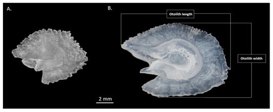- Wright, P.J.; Panfili, J.; Morales-Nin, B.; Geffen, A.J. Types of calcified structures. A. Otoliths. In Manual of Fish Sclerochronology; Panfili, J., de Pontual, H., Troadec, H., Wright, P.J., Eds.; Ifremer-IRD Coédition: Brest, France, 2002; pp. 31–57. [Google Scholar]