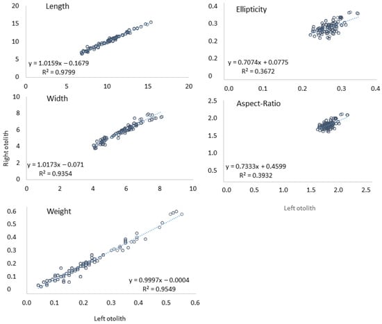 There were some differences between left and right asteriscii otoliths from the same individuals with the right otolith being bigger (i.e., otolith length and width) than the left otolith (Figure 3). Analysis of the relationships between fish length and each otolith feature (three size parameters and two shape indices) showed that there was a significant relationship between only two otolith size descriptors (length and width) with the total length of fish (column “TL”, Table 1). For three other otoliths features, the relationship with the total length was not significant (Figure 4).