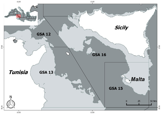- Geraci, M.L.; Ragonese, S.; Scannella, D.; Falsone, F.; Gancitano, V.; Mifsud, J.; Gambin, M.; Said, A.; Vitale, S. Batoid abundances, spatial distribution, and life history traits in the Strait of Sicily (Central Mediterranean Sea): Bridging a knowledge gap through three decades of survey. Animals 2021, 11, 2189. [Google Scholar] [CrossRef] [PubMed]