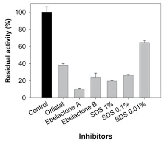 - Islam, M.A.; Parveen, F.; Hossain, K.; Khatun, S.; Karim, M.R.; Kim, G.S.; Absar, N.; Haque, M.S. Purification and biochemical characterization of lipase from the dorsal part of Cirrhinus reba. Thai J. Agric. Sci. 2009, 42, 71–80. Available online: https://www.thaiscience.info/journals/Article/TJAS/10469553.pdf?msclkid=b87f4ffacf4e11ec901022ef25c2cc1e (accessed on 1 May 2022).