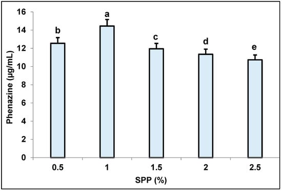 Several SPP concentrations were tested to choose the most suitable concentration for phenazine production (Figure 1). Based on the experimental data, the medium containing SPP at 1% recorded the highest content of phenazines at 14.44 µg/mL. At higher concentrations (1.5–2.5%), the yield of phenazines decreased (11.94–10.93 µg/mL). Thus, the concentration of SPP 1% was chosen for further tests.