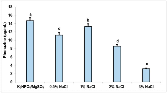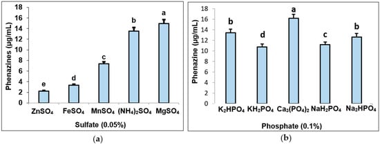 In various studies, chloride salts were commonly used for phenazine production [,,]. Therefore, we reconfirmed the effect of chloride salt (using NaCl) in this experiment at various concentrations, including 0.5, 1, 2, and 3% for phenazine production, and the combined salts (0.05% MgSO4 and 0.1% K2HPO4) used in the previous study [] were also added to the culture broth for comparison. The results are presented in Figure 2. Generally, NaCl also impacted phenazine biosynthesis; herein, the highest phenazine content (13.25 µg/mL) was measured in the medium containing 1% NaCl; however, this value was lower than that of the culture medium supplemented with the combined salts (14.66 µg/mL). The sulfate and phosphate salts were also conducted to supplement into the culture media for fermentation to induce phenazines in some earlier works [,]. Burton et al. reported the formation of PYO at a high yield in the medium containing 2% MgSO4, 0.04% K2HPO4, and 0.001% FeSO4 []. The optimum production of PYO was achieved in a medium comprising 0.05% MgSO4 and 0.05% K2HPO4 in the study by Georgia and Poe, 1932 []. However, the effect of types of various sulfate and phosphate salts was not elucidated. Thus, in the next test, we evaluated the impact of several types of sulfate and phosphate salts for phenazine-producing activity.