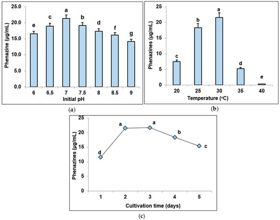 The effect of initial pH of culture broth (a), the fermentation temperature (b), and fermentation time (c) on phenazine biosynthesis by Pseudomonas aeruginosa TUN03. The different letters show a statistically significant difference. The LSD values; CV for the test of initial pH (0.0542; 0.123263, respectively), for the test of fermentation temperature (0.1108; 0.382522, respectively), and for the test of fermentation temperature (0.4742; 0.978673, respectively) are presented.