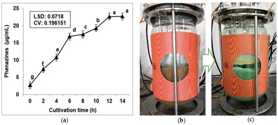 Because they hold vast arrays of valuable applications, phenazines have been studied for their production in numerous reports [,,,,,,,]. However, almost all the previous studies reported the bioproduction of phenazines on a small scale, in flasks, and used commercial media as a C/N source for fermentation. Few studies used bioreactors for the mass production of phenazines []. Recently, a phenazine was successfully produced in mass using a 5 L fermenter with a true working volume of 2 L (commercial medium) for fermentation, with the highest productivity of 3.6 mg/mL in 54 h of fermentation []. In this study, phenazines were produced on a large scale in 14 L bioreactor systems with a true working volume of 5 L, the fishery waste was utilized as the sole C/N source for fermentation, and phenazines were produced with a yield of 22.73 µg/mL in a short time of cultivation (12 h).