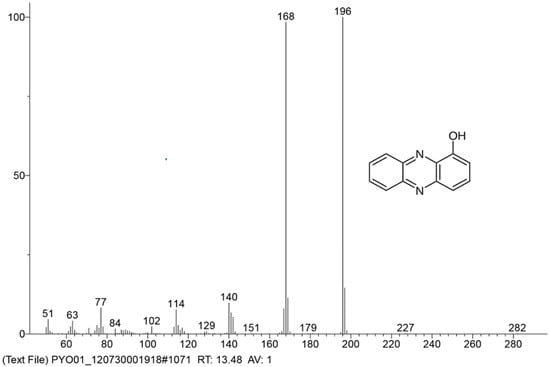 Recently, hemi-pyocyanin was also determined as the major compound produced by P. aeruginosa TUN03 in our previous work []. For more careful confirmation, this major phenazine compound was purified, then identified based on GC-MS, and its purity was confirmed via HPLC. Based on the comparison of the 10 largest mass fragments of the purified compound to those of the reference compound, this purified pigment was identified as hemi-pyocyanin. The GCMS profile of the purified hemi-pyocyanin is shown in Figure 6.