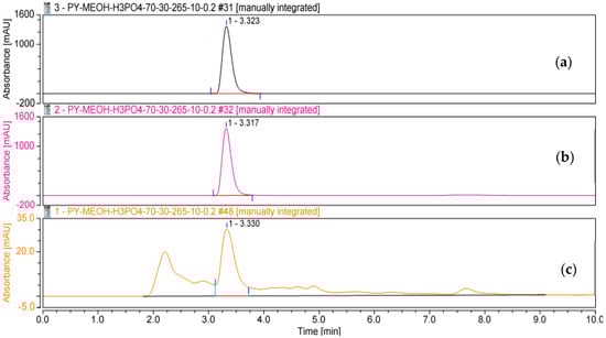 The HPLC fingerprinting of hemi-pyocyanin (purified in this work (a), the reference compound (b), and the crude pigments (c)).
