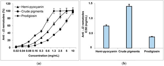 The anti-J2 activity (%) of purified hemi-pyocyanin, crude pigments, and prodigiosin (a), and their effects were expressed as IC50 values (b). The experiments of the anti-J2 nematode were conducted in three repetitions. The samples were tested at various concentrations for 2 d. The mobilized and immobilized J2 nematodes were counted using stereoscopic microscope Olympus SZ5 for estimation of the inhibitory activity.