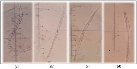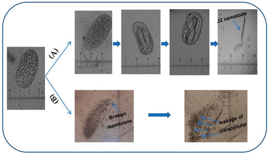 In vitro assay of egg-hatching inhibition: 100 μL of the sample solution at various concentrations was combined with sterile distilled water containing 200 nematode eggs; then, this mixture was incubated at 28 °C. The number of hatching eggs was counted per day after three days up to six days of incubation (based on J2 nematodes).