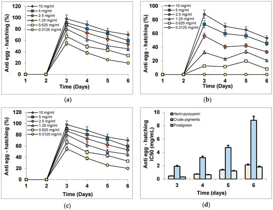 The egg-hatching inhibitory effect (%) of hemi-pyocyanin (a), crude pigments (b), and prodigiosin (c), and their effect was expressed as IC50 values (d). The graph bioactivity was constructed by Microsoft Excel 2010. The nematode eggs were treated with six concentrations of samples (0.313, 0.625, 1.25, 2.5, 5, and 10 mg/mL) and followed up by counting the amount of egg hatching using stereoscopic microscope Olympus SZ5 for estimation of the activity during the 6 days of treatment. All the experiments were conducted in three repetitions.