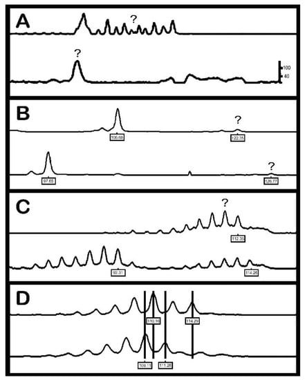 - Dakin, E.E.; Avise, J.C. Microsatellite Null Alleles in Parentage Analysis. Heredity 2004, 93, 504–509. [Google Scholar] [CrossRef] [PubMed]