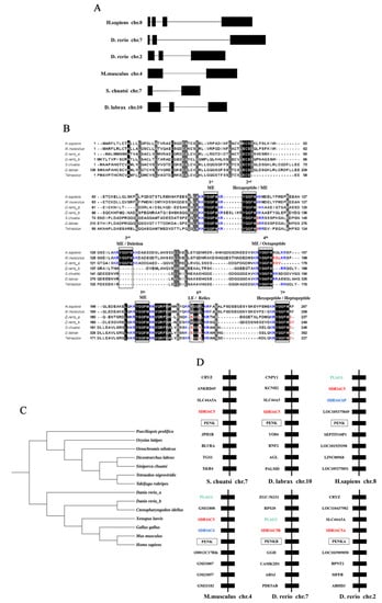 By comparing and analyzing the DNA and cDNA sequences of PENK gene, the exon and intron segments were distinguished. In order to determine the homology relationship of PENK genes between mandarin fish and other species, we searched for the PENK gene of mandarin fish, human, mouse, zebrafish, and European seabass in the mandarin fish database (http://genomes.igb-berlin.de/cgi-bin/hgGateway?db=sinChu7 (accessed on 23 April 2021)), the Ensembl database (http://asia.ensembl.org/index.html(accessed on 26 April 2021)), the NCBI website (http://www.ncbi.nlm.nih.gov/mapview/(accessed on 27 April 2021)), and the European seabass database (http://genomes.igb-berlin.de/cgi-bin/hgGateway?db=dicLab1(accessed on 28 April 2021)). A synlinear analysis was carried out together with mandarin fish at the same time. Amino acid sequence alignments were analyzed with Jalview software. Table 1 lists the amino acid sequences of the PENK gene in different species. All amino acid sequences were used for a phylogenetic analysis of the PENK gene.