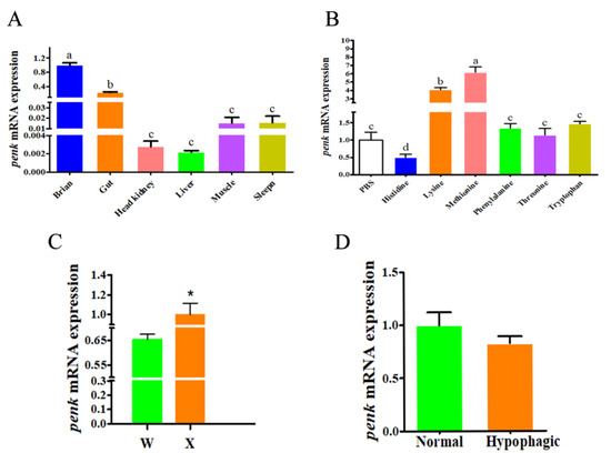 The RT-PCR experiments revealed that the PENK gene was expressed in every tissue of all the examined mandarin fish, including in the brain, the intestine, muscles, the head kidney, the spleen, and the liver (Figure 2A). The strongest signal was seen for the brain, which was significantly higher than in the other tissues (p < 0.05). When studying the relationship between the penk gene and food intake of mandarin fish, the expression of penk mRNA in the brain was significantly increased after an ICV injection of Lys or Met (p < 0.05) and was significantly decreased after a His injection (p < 0.05) (Figure 2B). By interrogating the relationship and difference of the penk gene expression in mandarin fish with different domestication abilities (Figure 2C), we found that the penk mRNA expression in the brain of group X, was significantly higher than the group W (p < 0.05). In order to study the role of the penk gene in the hypophagic induced by high-carbohydrate artificial diets feeding in fish, we detected the expression of penk mRNA in the brain of the hypophagic group and the normal group (Figure 2D), and a decrease was seen in the hypophagic group, but it showed no significant difference (p > 0.05).