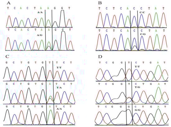 A total of four SNP loci related to easy domestication towards eating artificial diets were screened from the mandarin fish population. The following are the details: the penk-A site was located in intron 1, and two genotypes were detected, AA and AG (Figure 3A); the penk-B site was located in intron 1, and two genotypes were detected, CC and CG (Figure 3B); the penk-C site was located in intron 1, and three genotypes were detected, TT, TA, and AA (Figure 3C); and the penk-D site was located in exon 2, and three genotypes were detected, TT, TG, and GG (Figure 3D), encoding arginine. These were all was synonymous mutations.
