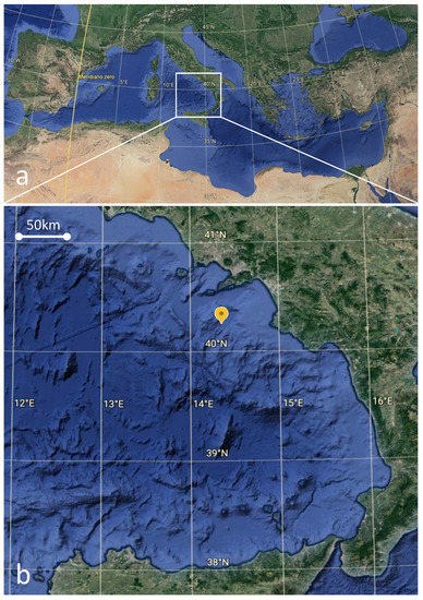 General view of the Mediterranean basin (a), with a particular of the studied area (GSA 10) (b). The yellow mark indicates the sampling point with coordinates (40°24.087″ N 14°35.396″ E).