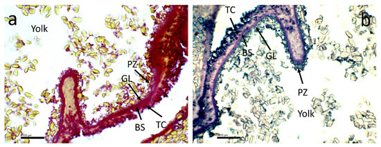 Presumed mature eggs were immediately fixed 4% paraformaldehyde in phosphate buffered saline (PBS) 0.1 mol/L (pH 7.4) for 4 h, dehydrated in graded ethanol, cleared in xylene, embedded in Paraplast® (McCormick Scientific, St. Louis, MO, USA) and cut into 5 μm serial sections. The sections were stained with Masson trichrome, and AB pH 2.5 staining followed by PAS (AB/PAS) [58]. Sections were examined under a Leica DM6B microscope equipped with a Leica DFC7000T.