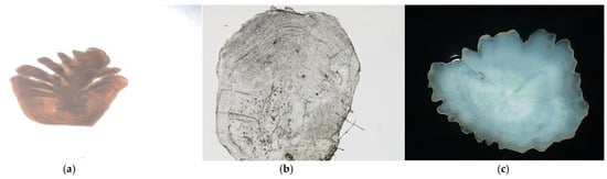 Fish species that are currently processed through the DeepOtolith platform: (a) Greenland halibut (Reinhardtius hippoglossoides) otolith, (b) Atlantic salmon (Salmo salar) scale, and (c) red mullet (Mullus barbatus) otolith.