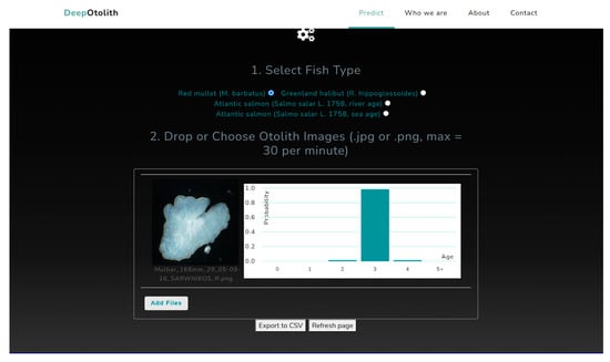 Snapshot of otolith images for the red mullet species, along with predicted probabilities for each age group. The highest probability implies the predicted age for the specific image. The user can upload at once or consecutively 30 images per minute through the “Add Files” button and extract age predictions in a CSV file (default name: “export.csv”) using the “Export to CSV” button. The “Refresh page” button allows the user to restart the age prediction process after completing the limit of 30 images per minute or testing a new species.