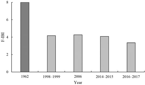 Chicago/Turabian StyleSu, Li, Youwei Xu, Yongsong Qiu, Mingshuai Sun, Kui Zhang, and Zuozhi Chen. 2022. "Long-Term Change of a Fish-Based Index of Biotic Integrity for a Semi-Enclosed Bay in the Beibu Gulf" Fishes 7, no. 3: 124. https://doi.org/10.3390/fishes7030124