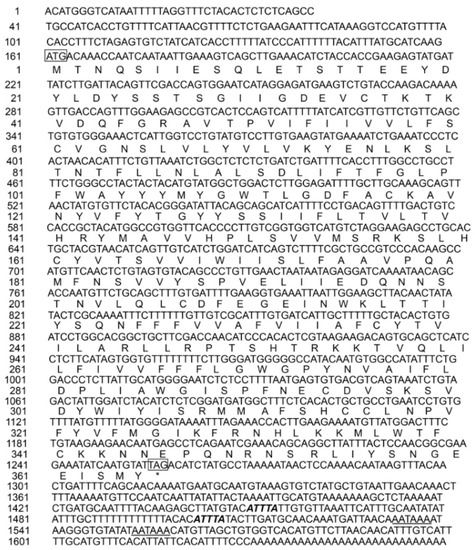 The full-length cDNA sequence of Ctenopharynodon idellus XCR1. The initiation codon “ATG” and the termination codon “TAG” are labeled by square frame; the termination signal is labeled by “*”; the mRNA tailing signal is labeled by italic and bold; and the mRNA instability motif is labeled by underline.