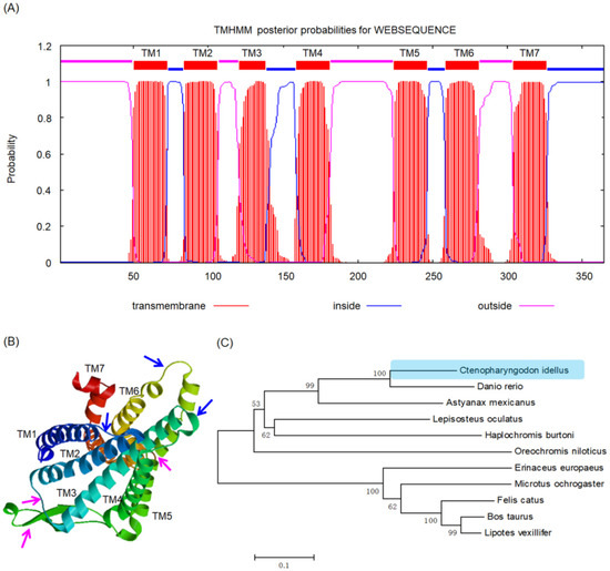 Molecular structure and evolutionary relationship of grass carp XCR1 protein. (A) Prediction of conserved transmembrane helical domains; (B) homologous tertiary structure, blue and pink arrows indicate cell inside and outside regions, respectively; (C) phylogenetic neighbor-joining tree constructed based on amino acid sequences of XCR1 gene, light blue background indicates the evolutionary position of grass carp XCR1.