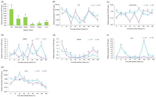 Relative expression of XCR1 gene in different organs or tissues of grass carp. (A) The relative expression of the XCR1 gene in tissues or organs of grass carp, the different letters above the bars indicate that there were significant differences between the data; (B–F,G) The relative expression of the XCR1 gene in the indicated sites of grass carp at different times after artificial infection of GCRV. P1, male parent grass carp with GCRV resistance; F1, the first-generation offspring of P1. Asterisks indicate significant differences in XCR1 gene expression between P1 and F1. *, p < 0.05; **, p < 0.01. The different letters indicate that there were significant differences between different times after artificial infection of GCRV. * p < 0.05; ** p < 0.01; *** p < 0.001.