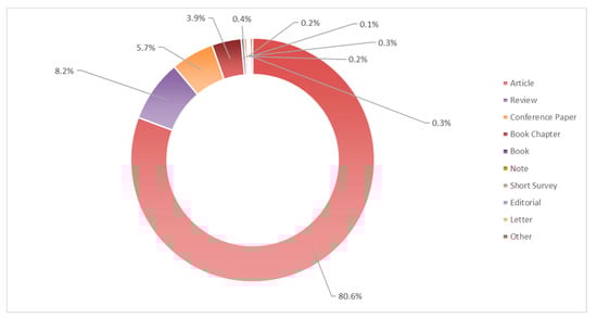 Figure 3 reports the distribution of documents by type concerning seafood/fish/nutrients/bioactive compounds publications. It includes mainly “Article”, representing 80.6%, followed by “Review” 8.2%, and “Conference paper” (5.7%).